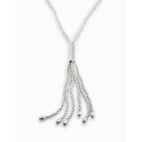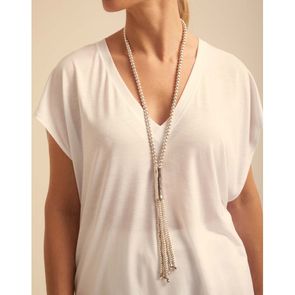 Collar largo que simula el diseño de un látigo formado por cuentas redondas de metal bañado en plata y con un regulable cierre de mosquetón.Largo 110-112 cms