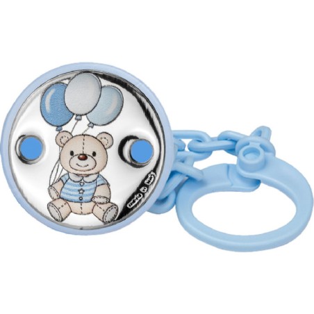 Pinza chupete en color azul celeste.Material plastico y baño de plata.