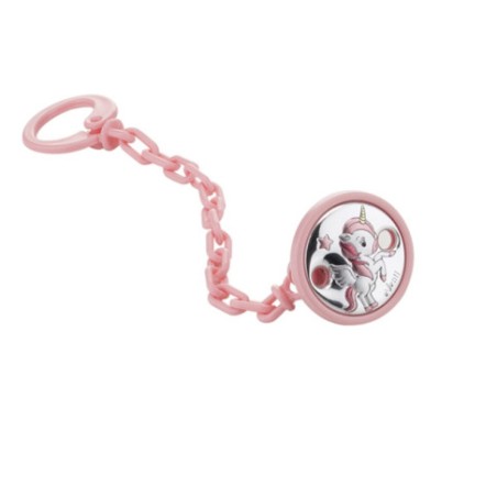 Pinza para chupete en rosa.Material plastico y baño de plata.