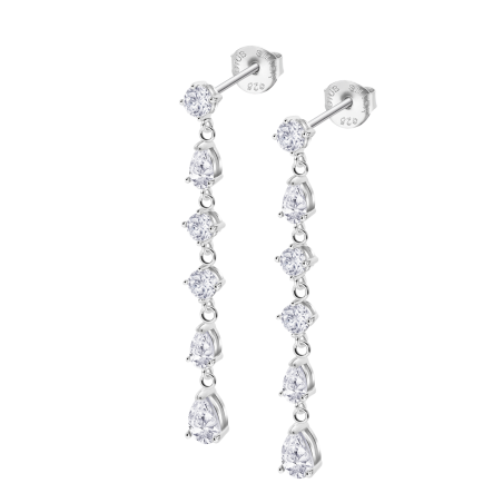 Pendientes en forma de cascada con doble óvalo, cada uno de diferente tamaño. En el óvalo inferior se encuentra un pequeño cristal facetado de color gris plateado.